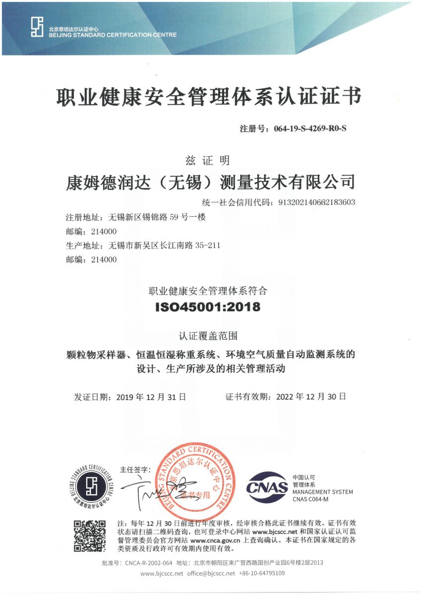 2019年12月31日,康姆德潤達(無錫)測量技術(shù)有限公司正式獲得ISO45001:2018職業(yè)健康安全管理體系認證,這標志著我公司在職業(yè)健康安全管理上緊貼國際先進管理模式,為公司后續(xù)的安全穩(wěn)定及可持續(xù)發(fā)展提供了強有力的保障。