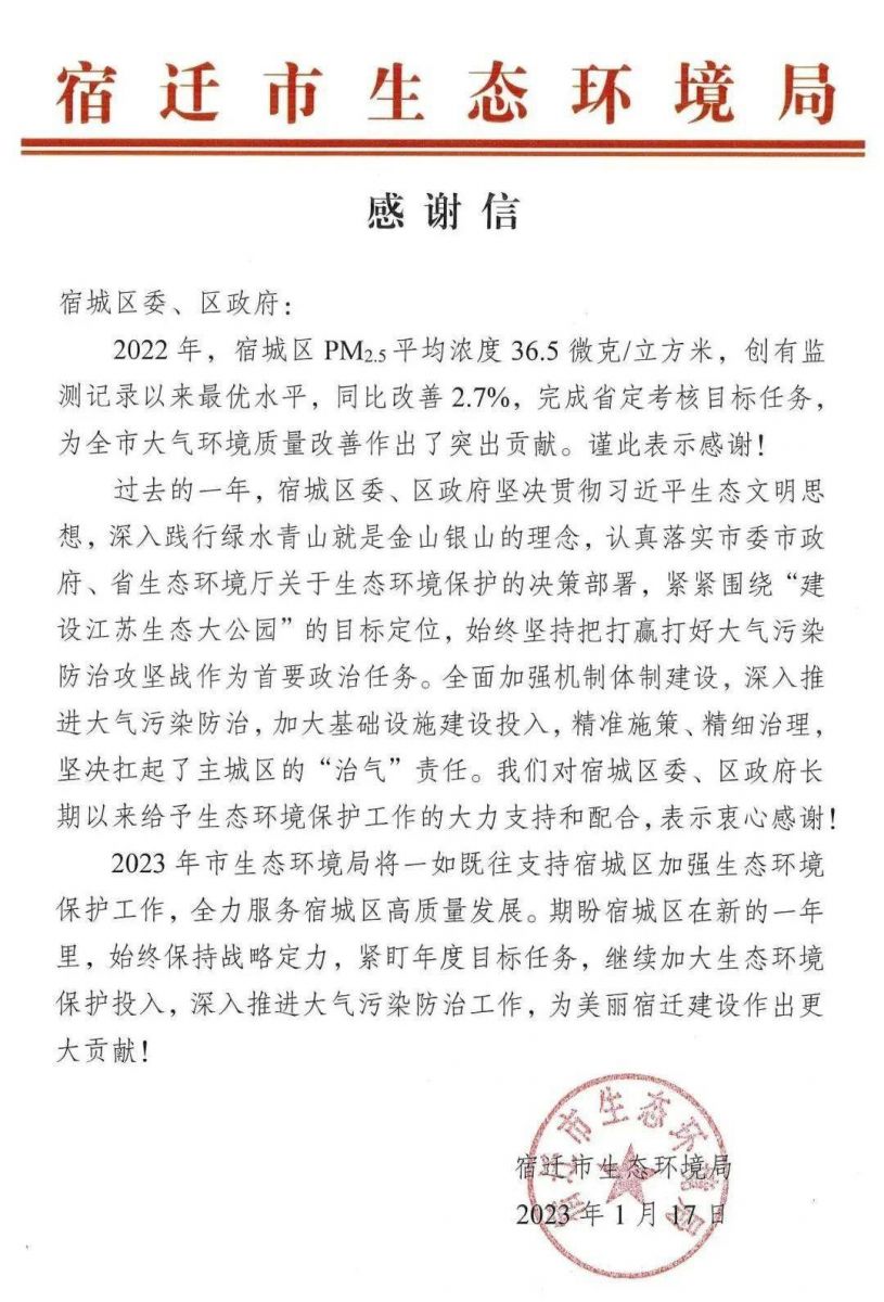 1月18日,宿遷市生態(tài)環(huán)境局向宿城區(qū)委、區(qū)政府表示感謝:“2022年,宿城區(qū)PM2.5平均濃度36.5微克/立方米,創(chuàng)有監(jiān)測記錄以來最優(yōu)水平,同比改善2.7%,完成省定考核目標任務,為全市大氣環(huán)境質量改善作出了突出貢獻。謹此表示感謝!”。