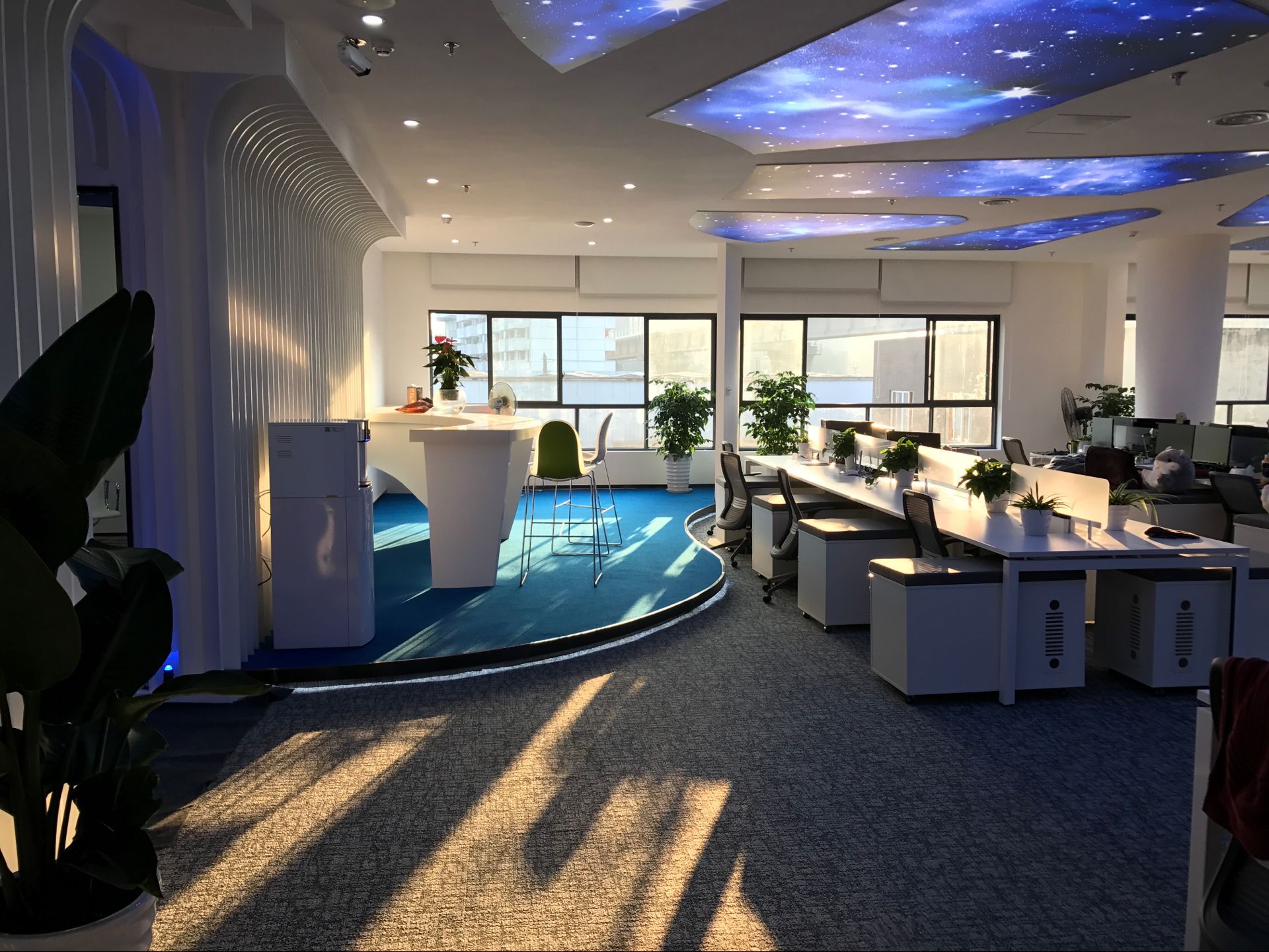 全開放式的辦公空間設(shè)計(jì)是互聯(lián)網(wǎng)式創(chuàng)意團(tuán)隊(duì)的小創(chuàng)意,這讓不同部門之間輕松對(duì)話、交流、協(xié)作,項(xiàng)目信息能實(shí)時(shí)互通,大大促進(jìn)了工作效率。隔板、綠植、茶幾式儲(chǔ)物柜...無處不在的細(xì)節(jié)設(shè)計(jì)和貼心裝飾,無一不增加了工作的情趣。