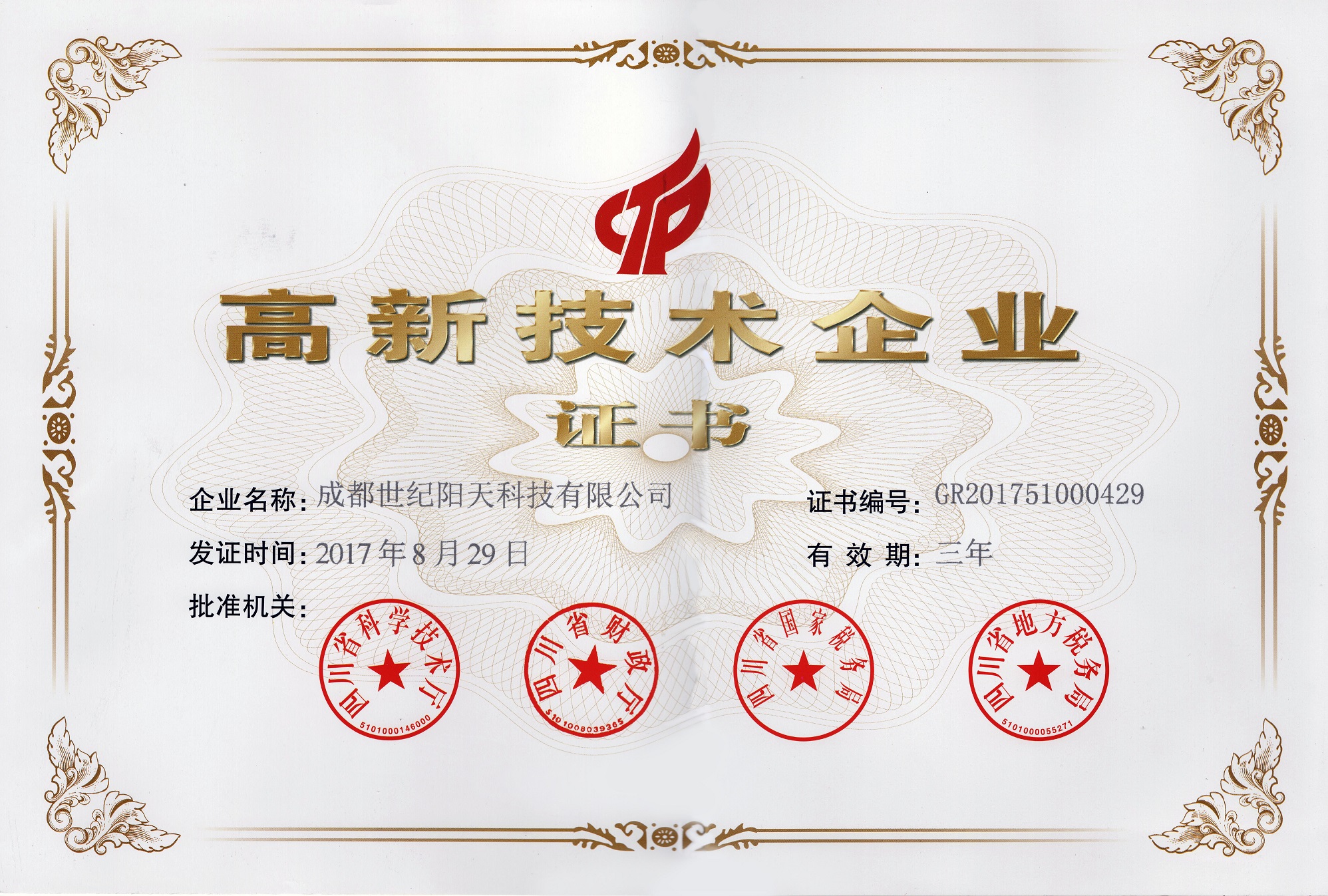 2017年,成都世紀(jì)陽天科技有限公司收到并積極響應(yīng)由國(guó)家科學(xué)技術(shù)部、財(cái)政部、國(guó)家稅務(wù)總局頒發(fā)關(guān)于印發(fā)《高新技術(shù)企業(yè)認(rèn)定管理辦法》的通知,依據(jù)《高新技術(shù)企業(yè)認(rèn)定管理工作指引》的規(guī)定,經(jīng)過數(shù)月的籌備工作,并經(jīng)四川省科學(xué)技術(shù)廳、省財(cái)政廳、省國(guó)家稅務(wù)局及四川省地方稅務(wù)局專家的層層評(píng)審,最終順利喜獲“四川省高新技術(shù)企業(yè)證書”,證書編號(hào)為:GR201751000429。