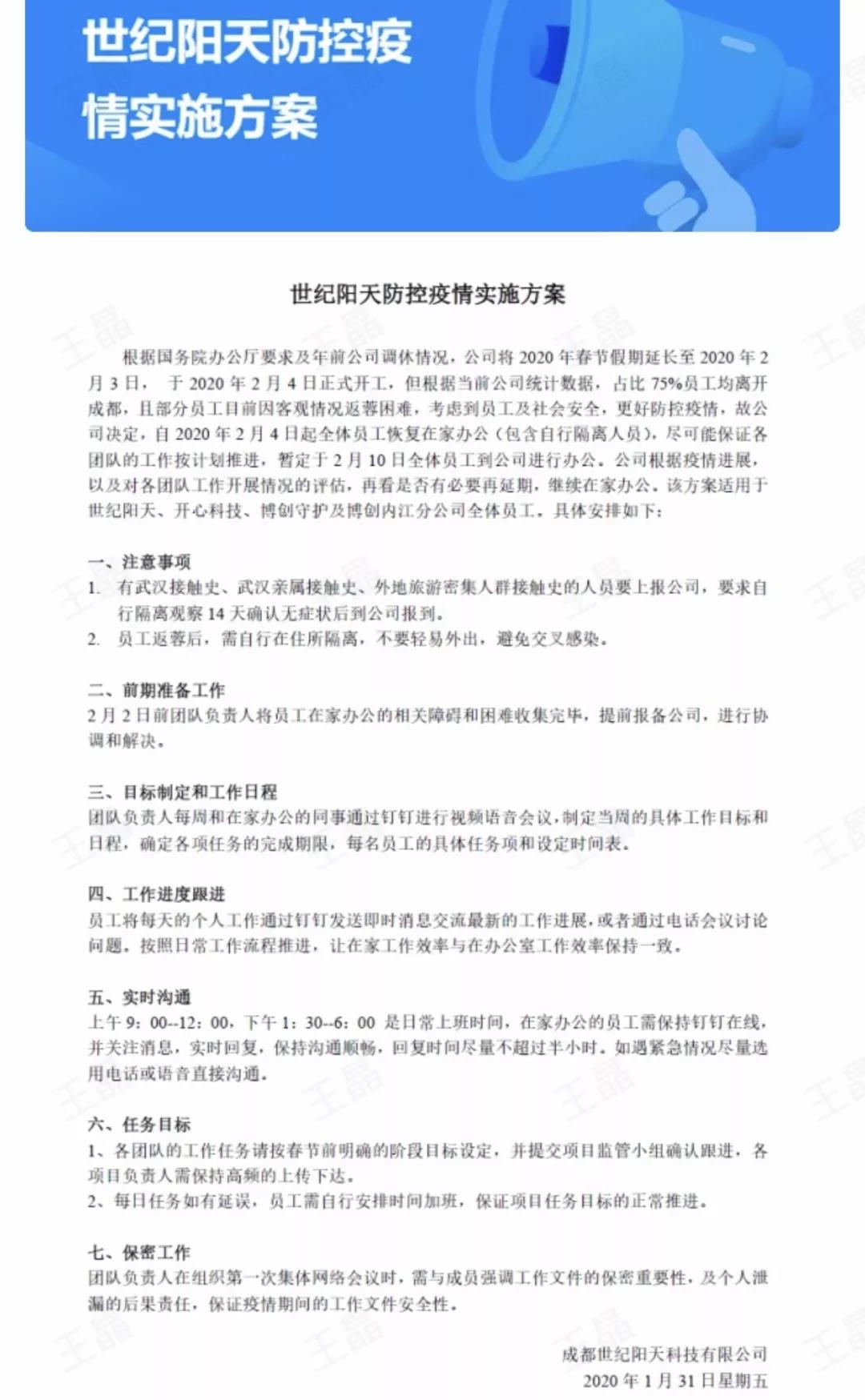 肺炎當(dāng)前,生活要繼續(xù),工作也要繼續(xù)!考慮到員工及社會(huì)安全,避免人員聚集增加疫情風(fēng)險(xiǎn),同時(shí)確保公司各項(xiàng)工作業(yè)務(wù)不受影響,公司研究決定自2月4日起全體員工恢復(fù)在家辦公。在家辦公期間各團(tuán)隊(duì)需進(jìn)行目標(biāo)制定、工作進(jìn)度跟進(jìn)及成員間保持線上實(shí)時(shí)溝通、保證各團(tuán)隊(duì)工作按計(jì)劃推進(jìn)。全體員工必須明確在家辦公≠不上班!與此同時(shí)大家也應(yīng)做好自身防護(hù)措施,為抗擊疫情貢獻(xiàn)一份力量!