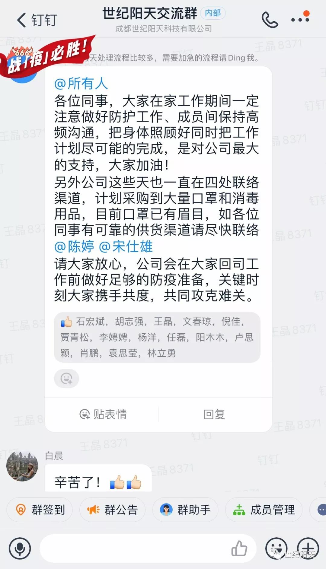 公司利用釘釘工作交流群對(duì)政府部門“疫情防控”的決策部署、疫情防控相關(guān)知識(shí)等進(jìn)行持續(xù)推送,并積極引導(dǎo)正面輿論;實(shí)時(shí)傳達(dá)向董事長對(duì)于疫情防控期間公司工作的安排部署。同時(shí)根據(jù)向董事長的要求,公司職能團(tuán)隊(duì)已于近期聯(lián)絡(luò)相關(guān)渠道,計(jì)劃采購大量防疫物資,確保全體員工在返回公司辦公前供應(yīng)穩(wěn)定。線上線下多管齊下,共同打好疫情防控戰(zhàn)役。